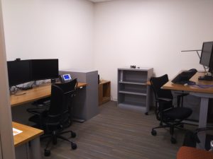 日本では「働き方改革」などを叫ばれていますが、米国では、在宅勤務(ホテリング)の審査官がかなり多くなってきているようです。左の写真は、在宅勤務の審査官が支局に出向いたときに使用する部屋です。