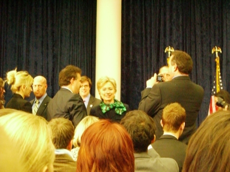 テレビでいつも見るヒラリーさんは原色系の鮮やかな色の服を着ていることが多かったのですが、今日のヒラリーさんは紺のスーツに緑のスカーフという、実におとなしい服装でした。よく見るとこのスカーフは、黒地にShamrockの模様が入っていました。今日はSt. Patrick’s Dayであることを意識した服装だったようです。
