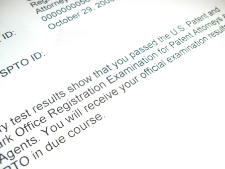 Preliminary test results show that you passed the U.S. Patent and Treadmark Office Registration Examination . . . .